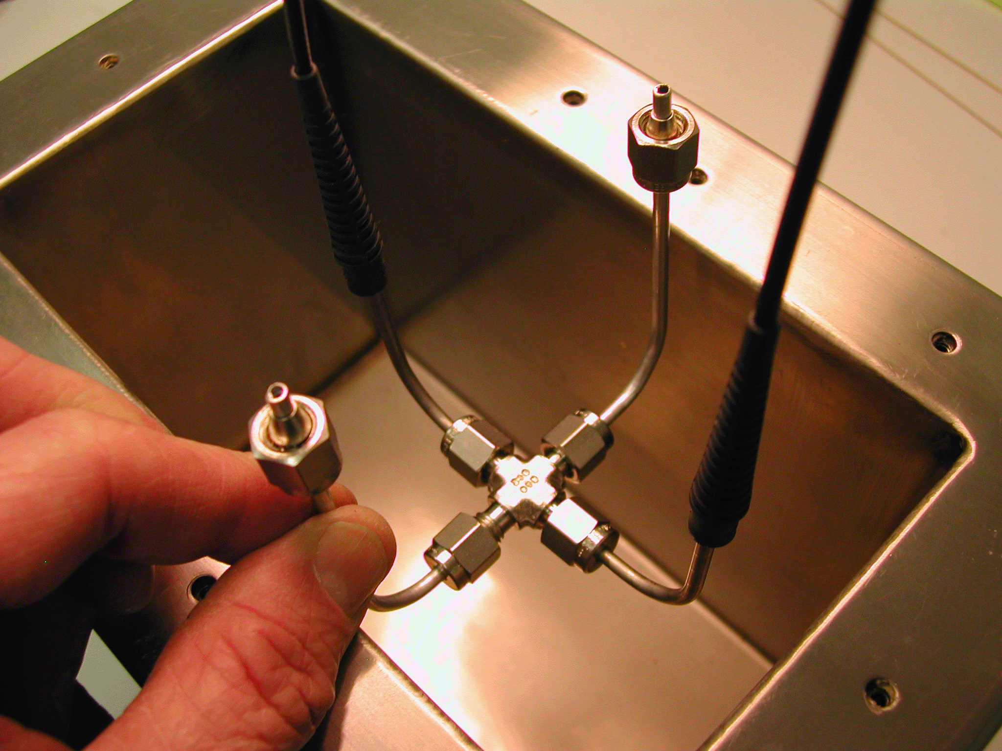 The piece pictured in this application is a 1/8" stainless steel flow through cell with fiber optic leads bent 90 degrees to facilitate insertion into a heated bath for control of experimental conditions. |